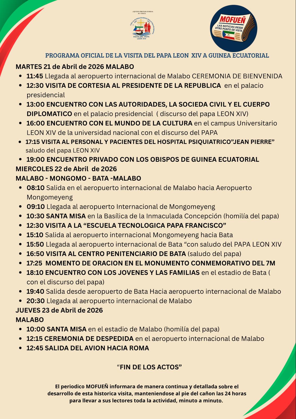 El programa oficial de la visita del Papa León XIV a Guinea Ecuatorial ya ha sido definido y contempla una agenda intensa durante tres días, con actividades distribuidas entre Malabo, Mongomo y Bata.